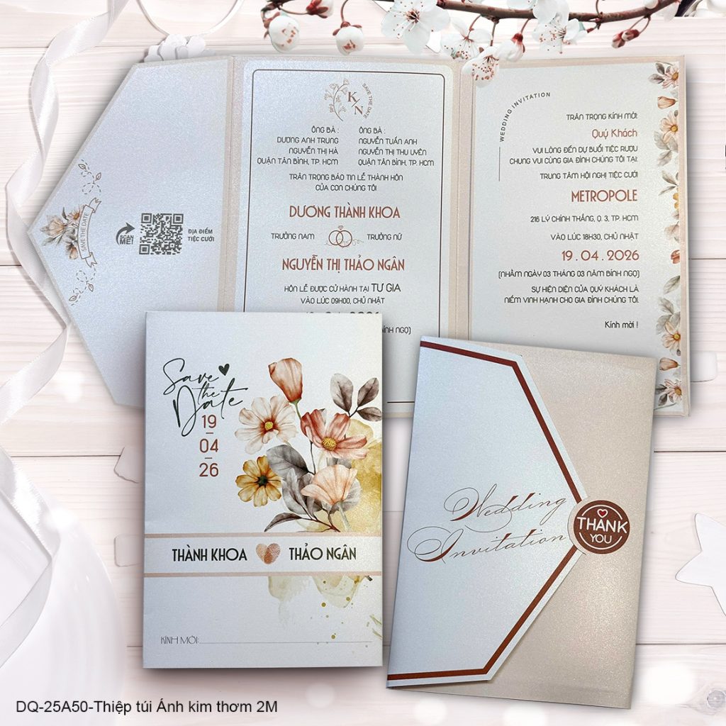 Mẫu thiệp cưới DQ-25A50 không chỉ là một lời mời, đó là một lời khẳng định về gu thẩm mỹ và sự chu đáo của bạn trong ngày trọng đại nhất cuộc đời.